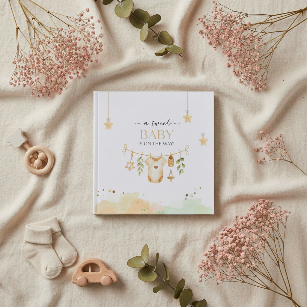 Minimalistinė ir jauki „Baby Shower“ prisiminimų knyga, sukurta būsimos mamos šventei.